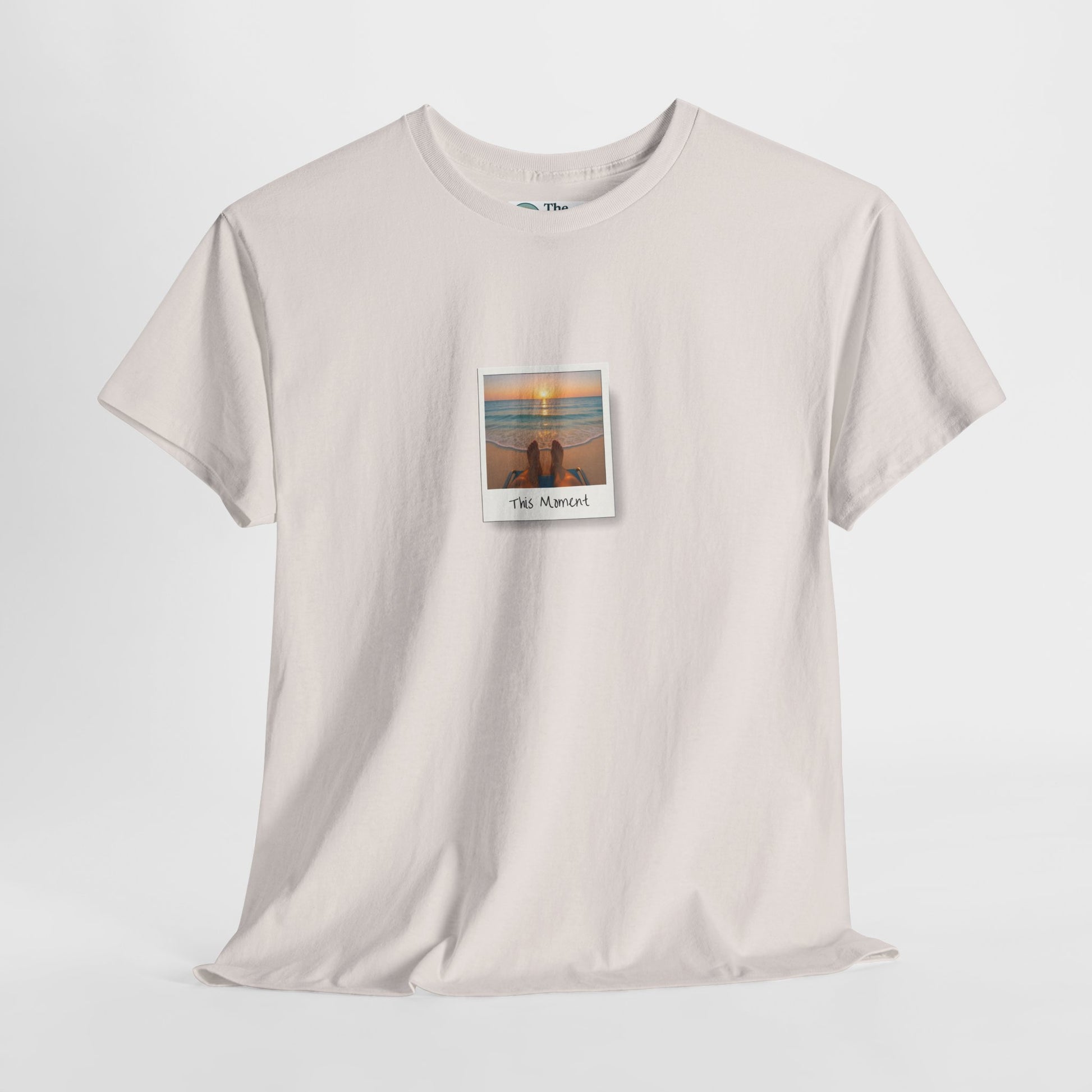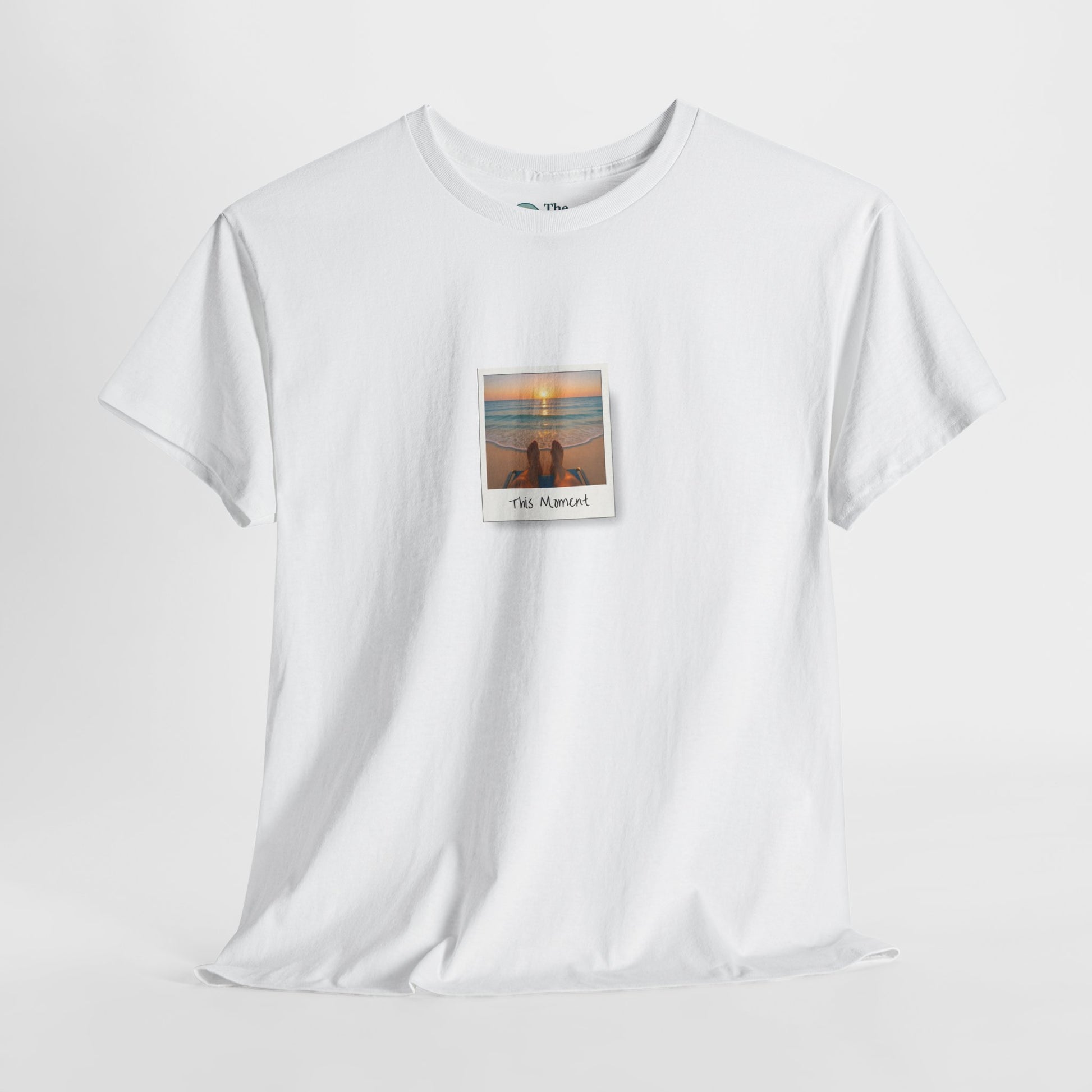 Our This Moment T-shirt captures the beauty of pure presence. Featuring a serene polaroid-style image of feet stretched out toward a glowing ocean sunset, this design is a visual reminder to pause, breathe, and savor life exactly as it is. Perfect for beach lovers, mindfulness practitioners, and anyone seeking to carry a little vacation calm into everyday life. Printed on a soft white tee with crisp, photorealistic detail for a truly relaxing vibe.